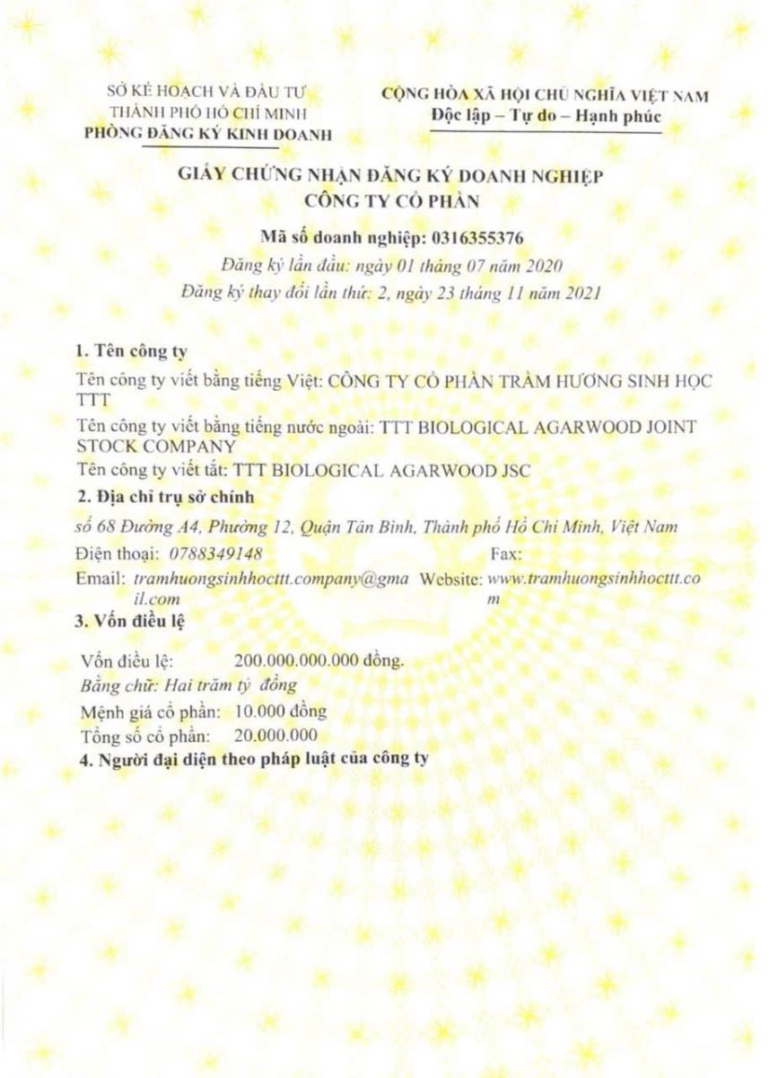 Giấy phép kinh doanh Công ty CP Trầm Hương Sinh Học TTT